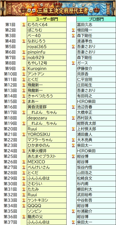 ■ 大会概要 【大会名】第38回三麻王決定戦 【期間】 2026年4月21日(火)00:00~4月30日(木)23:59 【ルール】 三人麻雀 連続6戦の最大合計得点 【会場】 イベントB 【参加対象】 龍龍有料会員 【特典】 1位 会員期限40日 […]