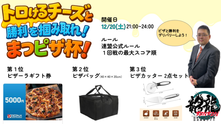 ■ 大会概要 【大会名】 とろけるチーズと勝利を掴み取れ!まつピザ杯! 松澤悠介プロの挑戦です! 【期間】 2025年12月20日(土)21:00~24:00 【ルール】 東風戦 四人麻雀 連盟公式ルール 【集計方法】 1戦の最大成績 【会場】 イベ […]